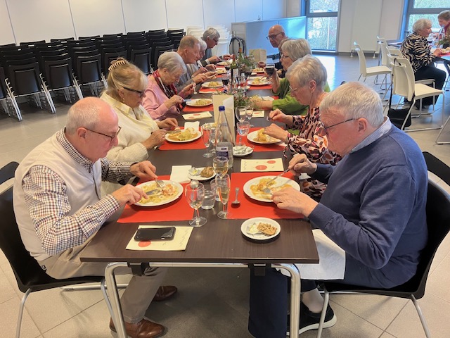 Er was regen in de voormiddag, maar het zonnetje scheen in de namiddag bij aanvang van de wandeling.We waren met veertien waarvan zes mensen de kleine toer hebben gemaakt. De betere stappers hebben nog de langere lus meegenomen mooi door de weiden en een stuk bos. De plassen op de veldwegen vielen eigenlijk nog mee na de regenbuien van de vorige dagen. Een afsluiter met een drankje en daarna een pannenkoek waren zeer welkom.